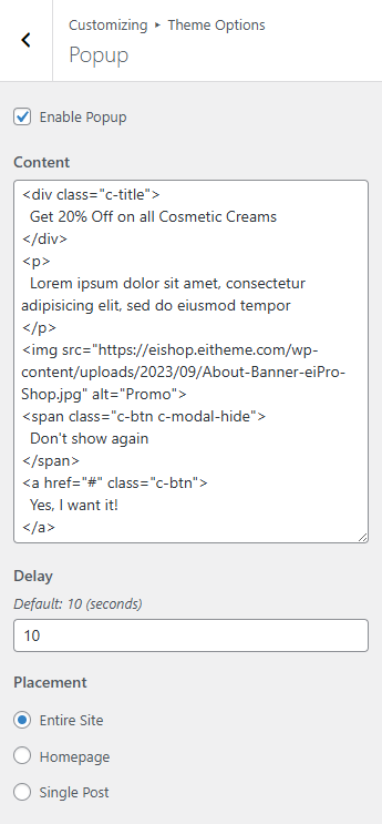 </a>Letakkan kode di atas ke Theme Options > Popup > Content, seperti gambar dibawah ini: